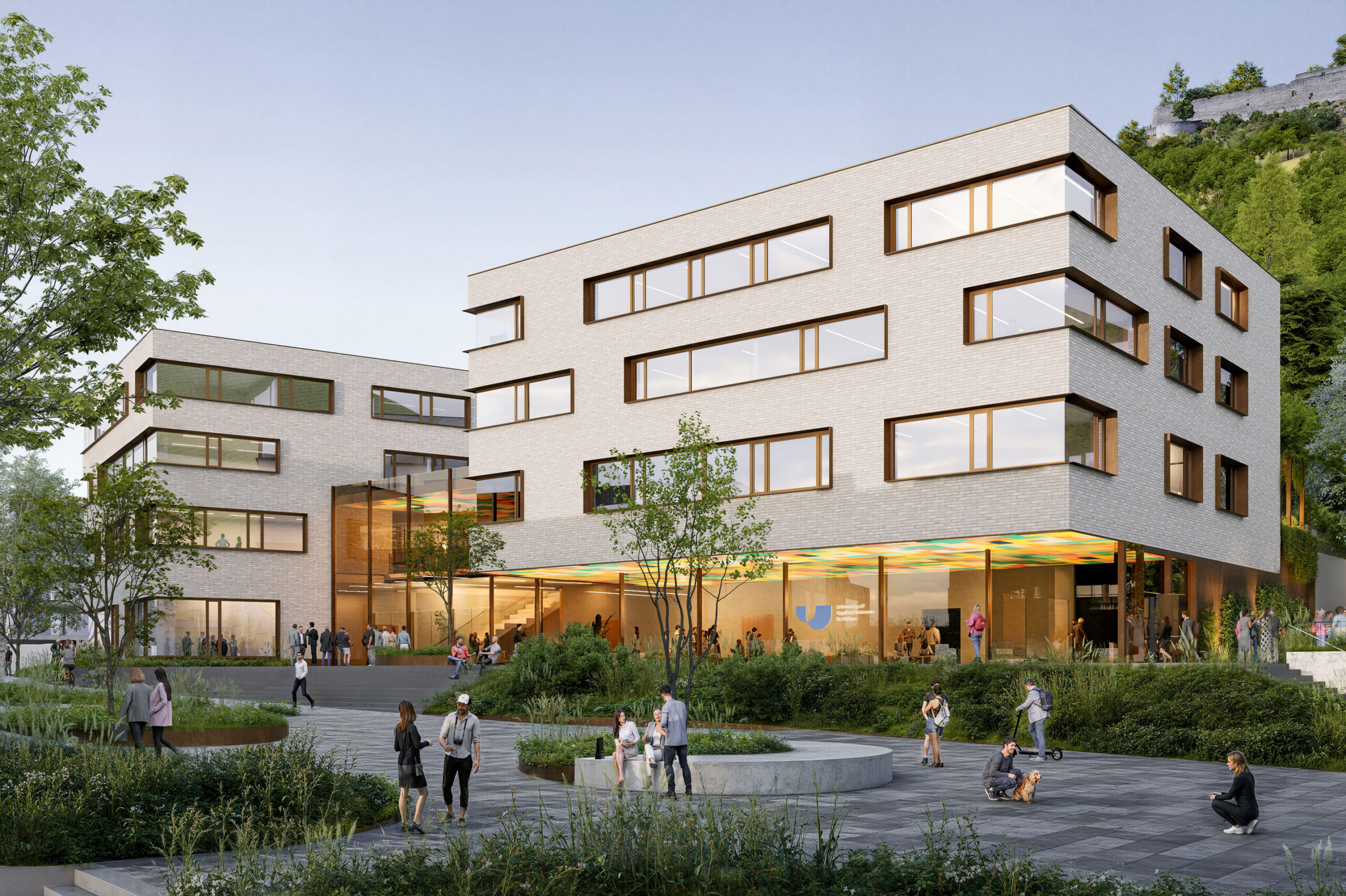 Die Herausforderung, ein Biotop für Innovationen zu gestalten, das modern in Erscheinung treten darf, sich jedoch gleichzeitig harmonisch in die schöne Stadt Hainburg mit ihren vielen Spuren aus dem Mittelalter einfügt, war besonders inspirierend. Das Entwurfskonzept folgt einem reduzierten Farbkonzept, das Inspiration in der Umgebung findet. Helle, rötliche, bräunliche und graugrüne Farbtöne, werden umrandet vom bestehenden und neuen Grün, sowie den felsigen Bergen/Hügeln und historischen Steinen von Stadtmauer und Burg – eine der ältesten und am besten erhaltenen mittelalterlichen Befestigungsanlagen Europas. Kleinteilige haptische Strukturen und auch moderne Materialien wie helle Klinker mit abgesetzter Fugenfarbe, sowie gefaltete Aluminiumpaneele richten sich nach der Maßstäblichkeit der Umgebung und menschlichen Wahrnehmung. Der kleinteilige Gestaltung des neuen Campus ist sinnlich, freundlich, offen und nahbar gestaltet um die Funktion als Hub für Wissenschaft, Wirtschaft und Gesellschaft zu unterstützen. Flanieren kann man am auf der Lebensader des Campus, dem weitläufigen Boulevard. Er bietet an vielen Punkten spektakuläre Aussichten sowie Aufenthaltsqualitäten. Die Gebäude für Forschung und Lehre wurden in kleinere Blöcke gegliedert um sowohl Durchblicke vom Ort aus in den schönen bewaldeten Hang unterhalb der Burg zu gewährleisten, als auch Aussicht und Leichtigkeit für die NutzerInnen der Gebäude und des Boulevards zu schaffen. Abstrakte städtebauliche Achsen, die auf den historischen Bestand Bezug nehmen, werden zu spannenden Platz- und Wegsequenzen weiterentwickelt, die das Miteinander von mittelalterlicher Struktur und moderner Forschung erlebbar machen.